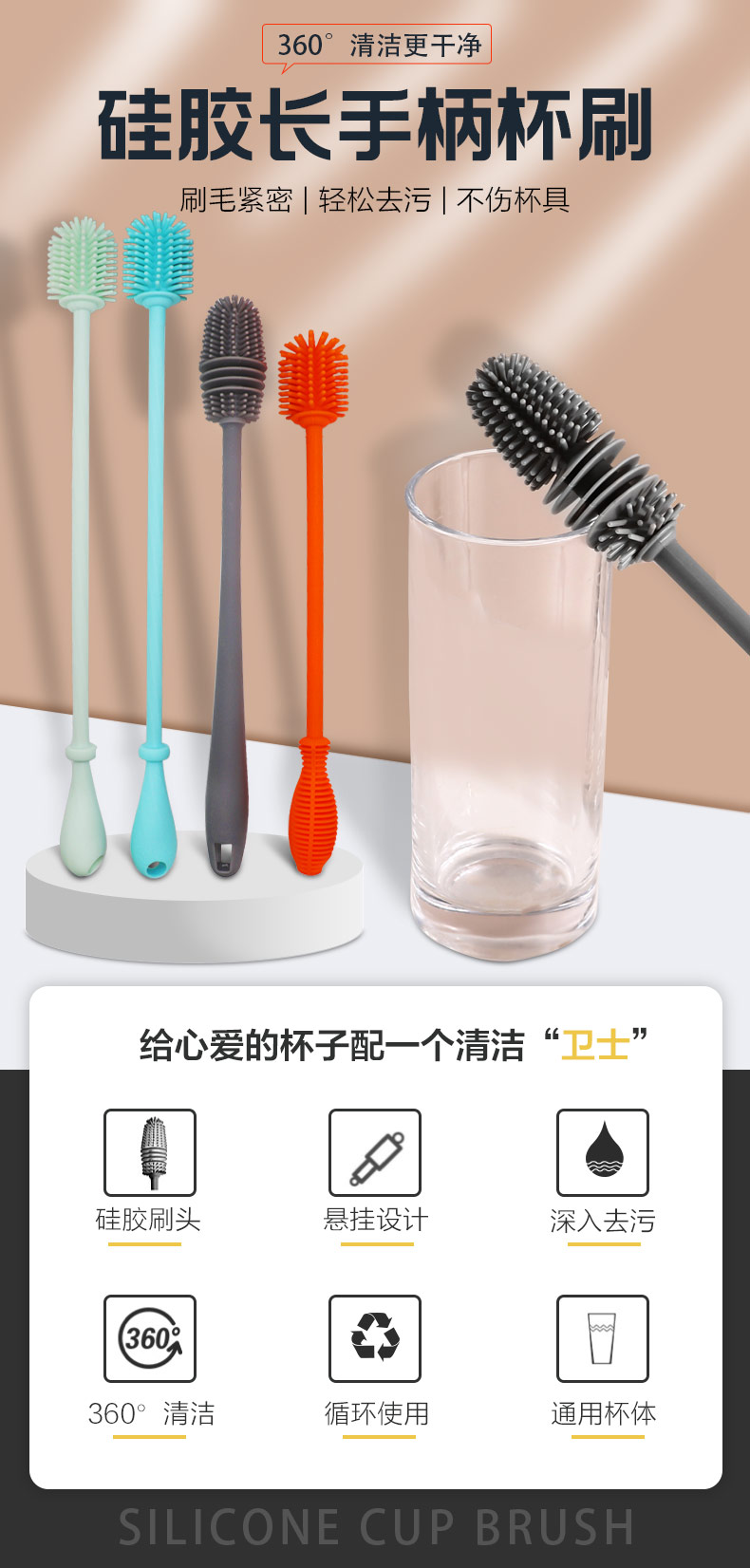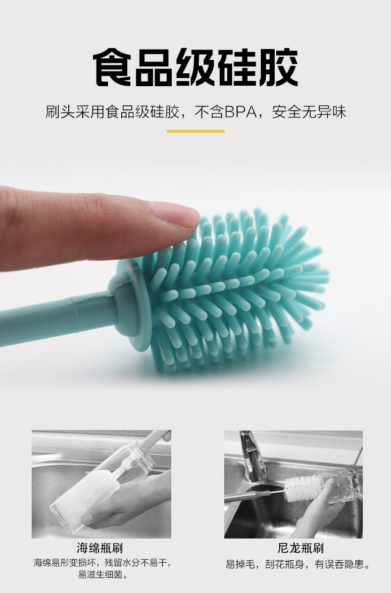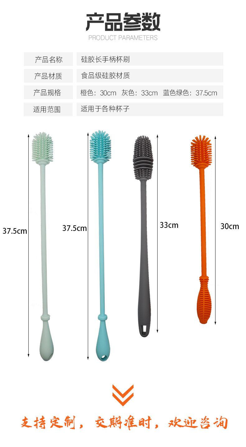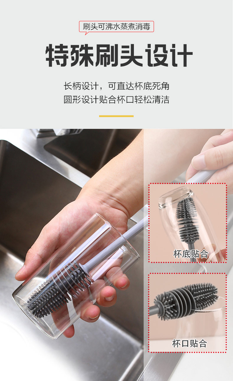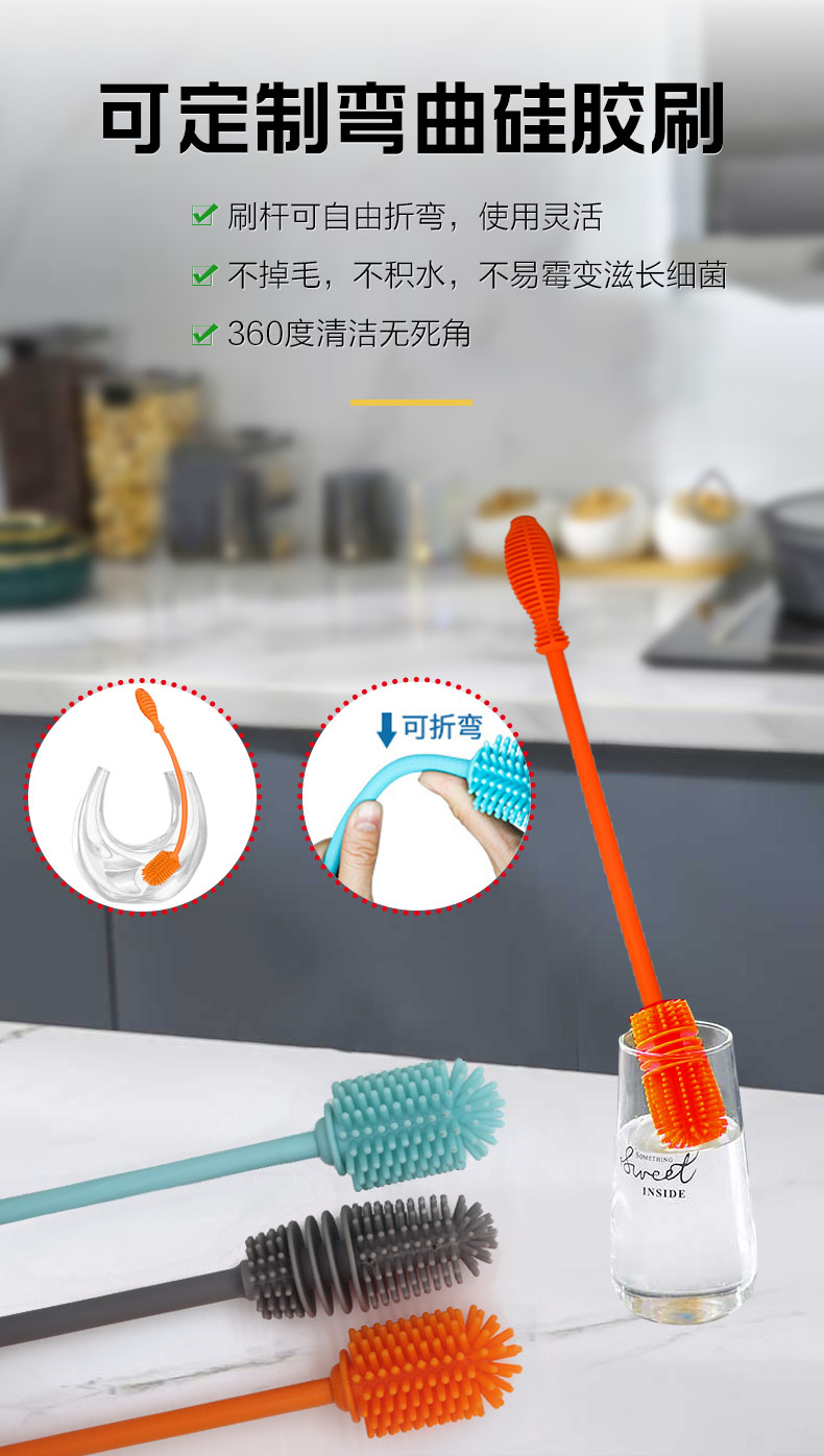 給心愛的杯子配一個硅膠刷,可以360度清潔水杯內壁,刷頭采用食品級硅膠,不含BPA,無異味,相比海綿瓶刷不容易變形,不容易殘留水分滋生細菌。適合各類杯子的清潔??铺├鳛橐患夜枘z制品OEM廠家,有能力也有條件定制可彎頭的硅膠刷,人性化的設計,易懸掛便利瀝水,節(jié)約空間。